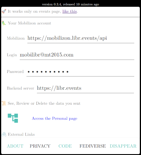 libr.eventsas it is the only backend I know of, but if you run the librevents backend you can configure your own. - 💡 Access the Personal page: this link brings you to the list of events you liberated, so you can review if they are correct and access to the Mobilizon entry where they can be updated if any detail was wrong.