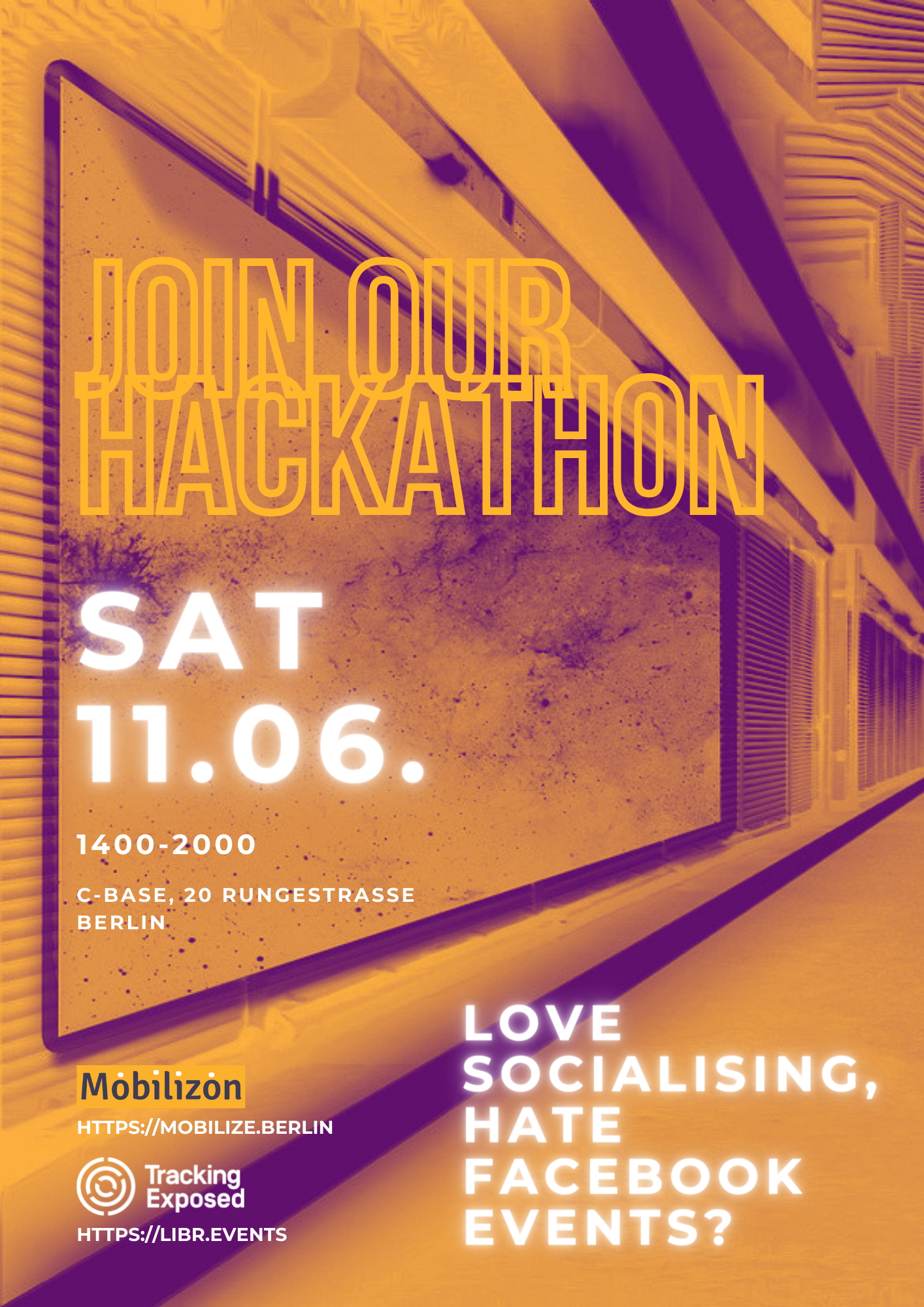 15 minutesOpening, welcoming everybody, explaining the context of mobilize berlin and why we felt the need for a hackathon, showing the free software ecosystem surrounding mobilizon (https://docs.joinmobilizon.org/contribute/integrations/)15 minutesinterview/survey event organizers to get their needs20 minutespresenting mobilizon reshare20 minutespresenting librevent and mobilizon-poster30 minutesdiscussion among participants: what to work at (hackathon goals, future goals, how to collaborate, design discussion)20 minutesbreak